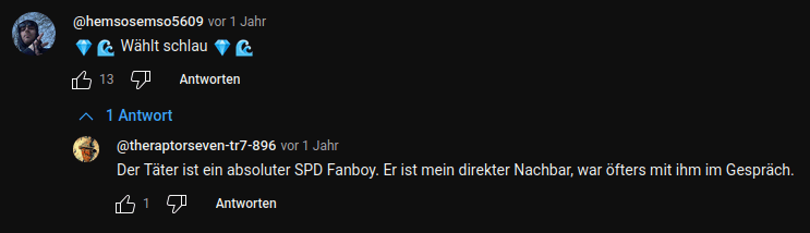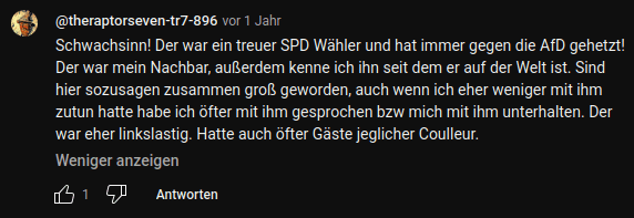 Wir kennen diese Haltung von Rechtsextremen und der AfD, für die jeder Mord, der durch “Ausländer” begangen wird, eine perfekte Gelegenheit ist, die eigene politische Agenda zu pushen. Dieser Kommentar ist ein weiteres Indiz dafür, dass das Umfeld von Daniel S. verschwörungsideologisch und politisch rechts eingestellt ist.